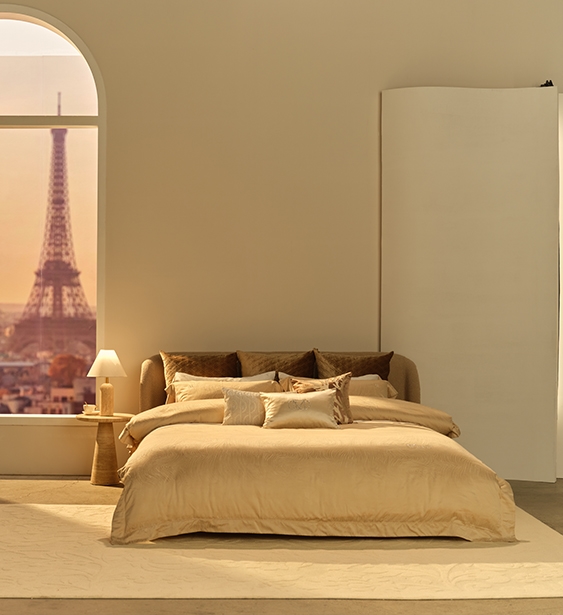 這款產(chǎn)品選用意大利進口的定制款羊絨絲棉提花面料,兼具了真絲的光澤與羊絨的柔軟觸感。獨特的香檳金色,搭配自由肌理的紋樣,彰顯了整個產(chǎn)品的低調(diào)奢華,瞬間提升了臥室調(diào)性。