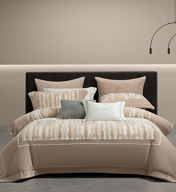 在絨面提花設(shè)計上,運用不同深淺的柔和色調(diào)打造出如同沙丘般此起彼伏的紋理,為臥室營造出溫馨且靜謐的氛圍。色布上的三框毛巾繡,增添了床品的層次感與趣味性。